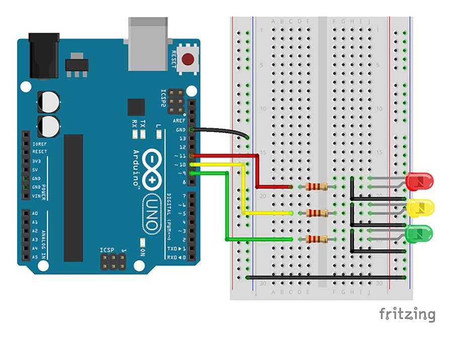 The diagram is pretty simple — connect up each arduino LED to pins 11, 10, and 9, respectively, along with the 220Ohm resistors for each LED. Remember to attach the Ground so the circuit can work! All in all, the circuit is very simple to put together.